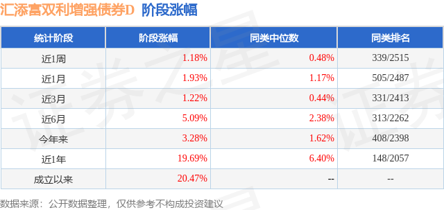 从业绩表现来看,汇添富双利增强债券D基金过去一年净值涨幅为19.69%,在同类基金中排名148/2057,同类基金过去一年净值涨幅中位数为6.4%。而基金过去一年的最大回撤为-3.05%,成立以来的最大回撤为-3.05%。