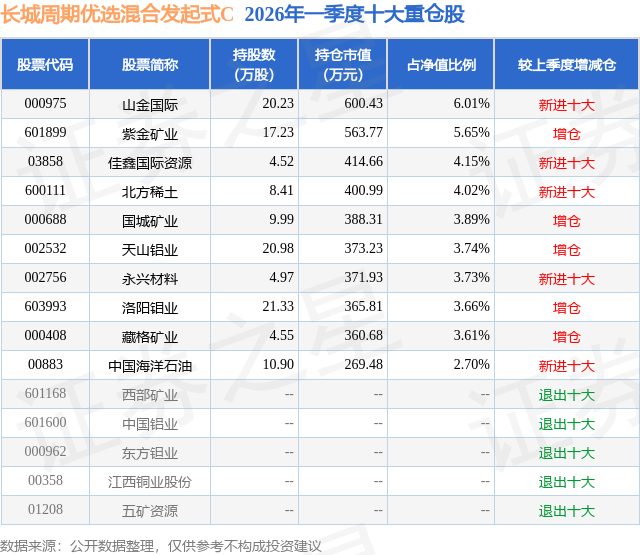 从基金规模来看,长城周期优选混合发起式C基金2026年一季度公布的基金规模为0.75亿元,较上一期规模208.36万元变化了7252.98万元,环比变化了3481.02%。该基金最新一期资产配置为:股票占净值比93.8%,无债券类资产,现金占净值比7.23%。从基金持仓来看,该基金当季前十大股票仓位达41.16%,第一大重仓股为山金国际(000975),持仓占比为6.01%。