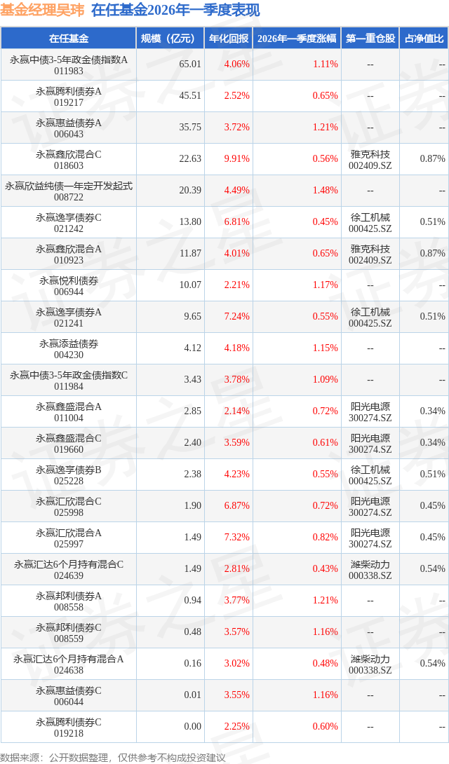 证券之星消息,日前永赢逸享债券A基金公布一季报,2026年一季度最新规模9.65亿元,季度净值涨幅为0.55%。