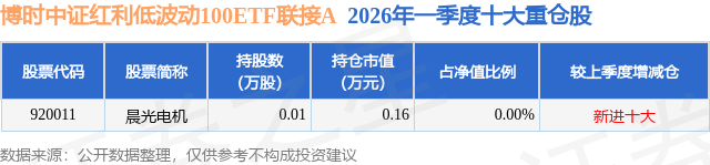 从基金规模来看,博时中证红利低波动100ETF联接A基金2026年一季度公布的基金规模为15.29亿元,较上一期规模1.82亿元变化了13.47亿元,环比变化了740.6%。该基金最新一期资产配置为:无股票类资产,无债券类资产,现金占净值比5.65%。从基金持仓来看,该基金当季前十大股票仓位达0.0%,第一大重仓股为晨光电机(920011),持仓占比为0.0%。
