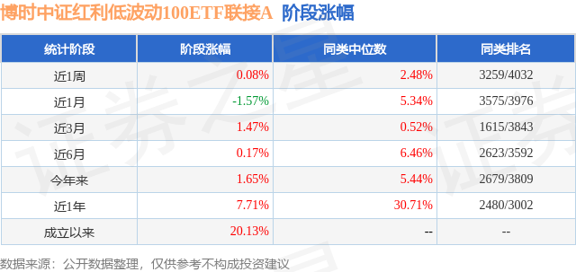从业绩表现来看,博时中证红利低波动100ETF联接A基金过去一年净值涨幅为7.71%,在同类基金中排名2480/3002,同类基金过去一年净值涨幅中位数为30.71%。而基金过去一年的最大回撤为-5.66%,成立以来的最大回撤为-7.54%。