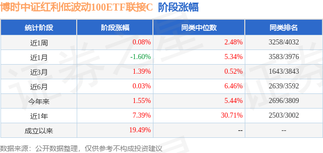 从业绩表现来看,博时中证红利低波动100ETF联接C基金过去一年净值涨幅为7.39%,在同类基金中排名2503/3002,同类基金过去一年净值涨幅中位数为30.71%。而基金过去一年的最大回撤为-5.71%,成立以来的最大回撤为-7.57%。