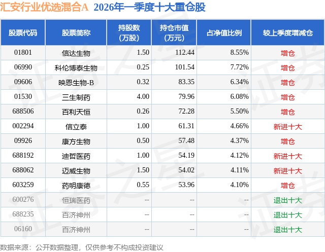 从基金规模来看,汇安行业优选混合A基金2026年一季度公布的基金规模为0.01亿元,较上一期规模183.82万元变化了-97.42万元,环比变化了-53.0%。该基金最新一期资产配置为:股票占净值比91.63%,无债券类资产,现金占净值比12.57%。从基金持仓来看,该基金当季前十大股票仓位达55.55%,第一大重仓股为信达生物(01801),持仓占比为8.55%。