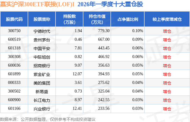从基金规模来看,嘉实沪深300ETF联接(LOF)I基金2026年一季度公布的基金规模为0.1亿元,较上一期规模3839.34万元变化了-2887.34万元,环比变化了-75.2%。该基金最新一期资产配置为:股票占净值比2.38%,债券占净值比1.33%,现金占净值比4.3%。从基金持仓来看,该基金当季前十大股票仓位达0.55%,第一大重仓股为宁德时代(300750),持仓占比为0.1%。