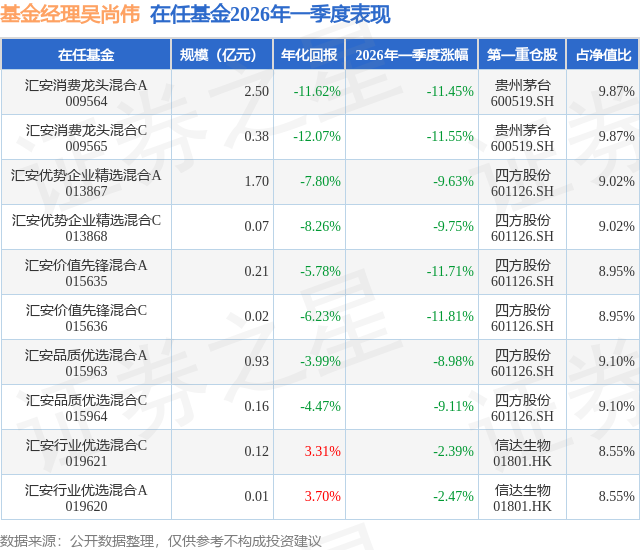 证券之星消息,日前汇安行业优选混合C基金公布一季报,2026年一季度最新规模0.12亿元,季度净值涨幅为-2.39%。