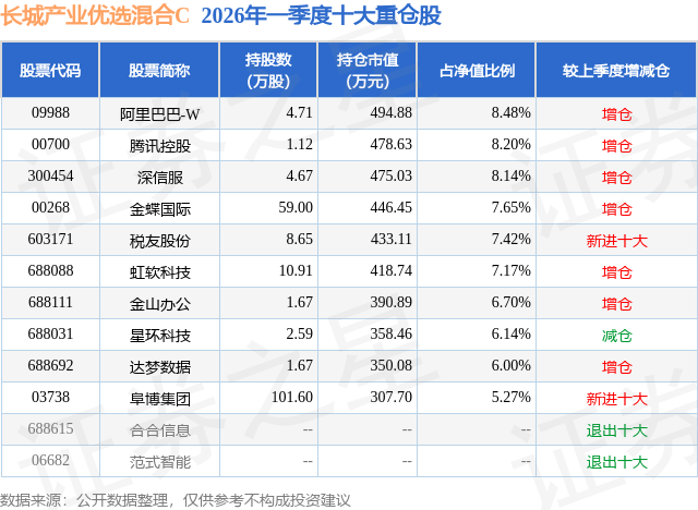 从基金规模来看,长城产业优选混合C基金2026年一季度公布的基金规模为0.33亿元,较上一期规模4858.97万元变化了-1530.43万元,环比变化了-31.5%。该基金最新一期资产配置为:股票占净值比93.61%,无债券类资产,现金占净值比6.45%。从基金持仓来看,该基金当季前十大股票仓位达71.17%,第一大重仓股为阿里巴巴-W(09988),持仓占比为8.48%。
