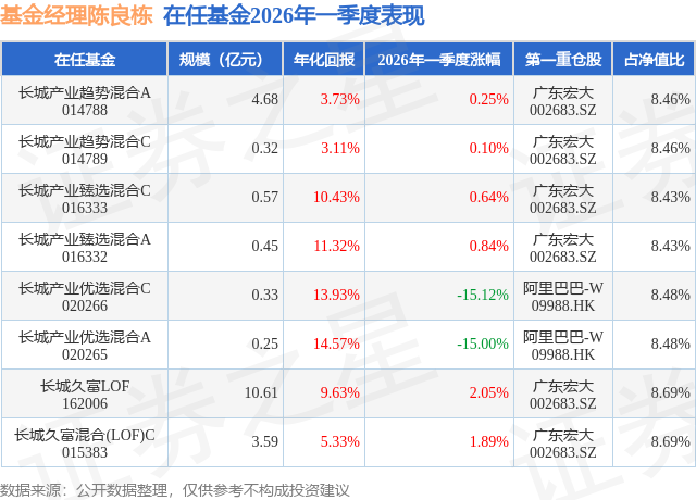 证券之星消息,日前长城产业优选混合C基金公布一季报,2026年一季度最新规模0.33亿元,季度净值涨幅为-15.12%。