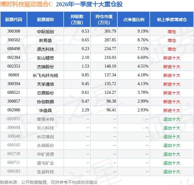 从基金规模来看,博时科技驱动混合C基金2026年一季度公布的基金规模为0.12亿元,较上一期规模465.06万元变化了757.72万元,环比变化了162.93%。该基金最新一期资产配置为:股票占净值比84.81%,无债券类资产,现金占净值比9.39%。从基金持仓来看,该基金当季前十大股票仓位达54.22%,第一大重仓股为中际旭创(300308),持仓占比为9.19%。