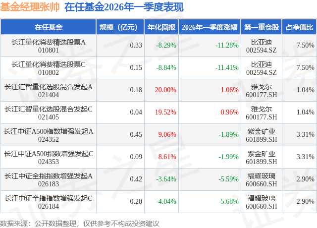 证券之星消息,日前长江汇智量化选股混合发起A基金公布一季报,2026年一季度最新规模0.18亿元,季度净值涨幅为1.06%。