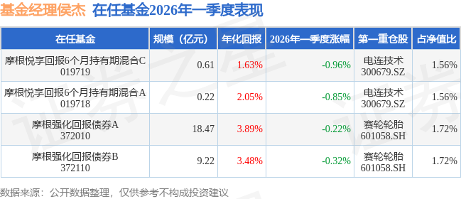 证券之星消息,日前摩根悦享回报6个月持有期混合A基金公布一季报,2026年一季度最新规模0.22亿元,季度净值涨幅为-0.85%。