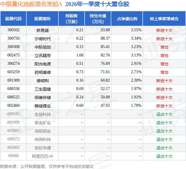 从基金规模来看,中银量化选股混合发起A基金2026年一季度公布的基金规模为0.16亿元,较上一期规模1122.8万元变化了467.5万元,环比变化了41.64%。该基金最新一期资产配置为:股票占净值比90.97%,债券占净值比5.34%,现金占净值比4.18%。从基金持仓来看,该基金当季前十大股票仓位达26.84%,第一大重仓股为新易盛(300502),持仓占比为3.55%。