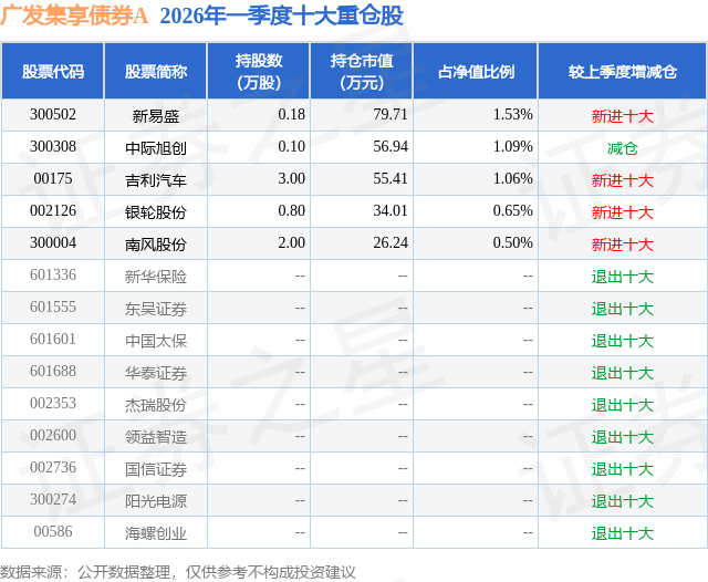 从基金规模来看,广发集享债券A基金2026年一季度公布的基金规模为0.27亿元,较上一期规模2.16亿元变化了-1.89亿元,环比变化了-87.46%。该基金最新一期资产配置为:股票占净值比4.83%,债券占净值比87.73%,现金占净值比7.7%。从基金持仓来看,该基金当季前十大股票仓位达4.83%,第一大重仓股为新易盛(300502),持仓占比为1.53%。