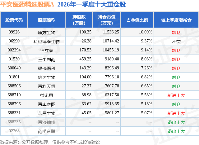 从基金规模来看,平安医药精选股票A基金2026年一季度公布的基金规模为5.08亿元,较上一期规模1233.02万元变化了4.96亿元,环比变化了4020.52%。该基金最新一期资产配置为:股票占净值比94.34%,债券占净值比2.0%,现金占净值比4.23%。从基金持仓来看,该基金当季前十大股票仓位达73.14%,第一大重仓股为康方生物(09926),持仓占比为10.09%。