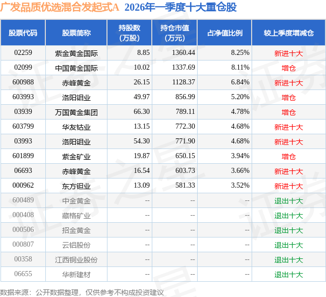 从基金规模来看,广发品质优选混合发起式A基金2026年一季度公布的基金规模为0.61亿元,较上一期规模1037.73万元变化了5087.72万元,环比变化了490.28%。该基金最新一期资产配置为:股票占净值比89.1%,无债券类资产,现金占净值比17.21%。从基金持仓来看,该基金当季前十大股票仓位达53.66%,第一大重仓股为紫金黄金国际(02259),持仓占比为8.25%。