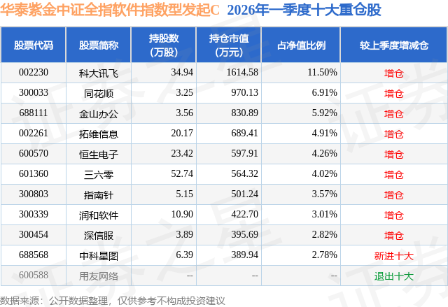 从基金规模来看,华泰紫金中证全指软件指数型发起C基金2026年一季度公布的基金规模为0.79亿元,较上一期规模2719.52万元变化了5207.16万元,环比变化了191.47%。该基金最新一期资产配置为:股票占净值比94.76%,债券占净值比1.8%,现金占净值比3.98%。从基金持仓来看,该基金当季前十大股票仓位达49.7%,第一大重仓股为科大讯飞(002230),持仓占比为11.5%。