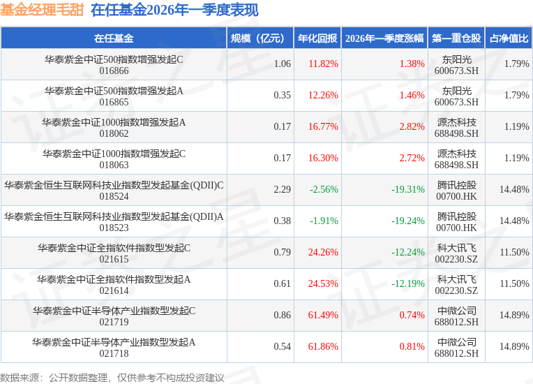证券之星消息,日前华泰紫金中证全指软件指数型发起C基金公布一季报,2026年一季度最新规模0.79亿元,季度净值涨幅为-12.24%。