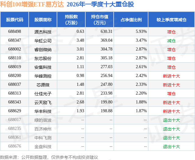 从基金规模来看,科创100增强ETF易方达基金2026年一季度公布的基金规模为1.06亿元,较上一期规模1.06亿元变化了51.15万元,环比变化了0.48%。该基金最新一期资产配置为:股票占净值比98.93%,无债券类资产,现金占净值比1.12%。从基金持仓来看,该基金当季前十大股票仓位达28.45%,第一大重仓股为源杰科技(688498),持仓占比为5.93%。