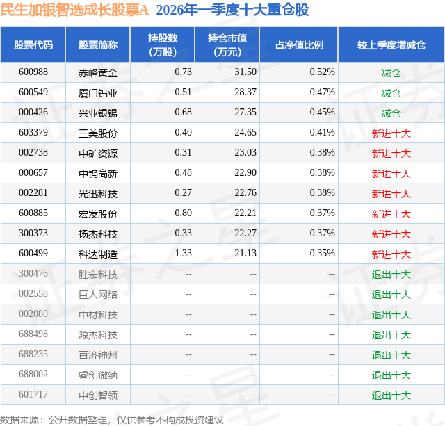从基金规模来看,民生加银智选成长股票A基金2026年一季度公布的基金规模为0.38亿元,较上一期规模3817.36万元变化了-47.01万元,环比变化了-1.23%。该基金最新一期资产配置为:股票占净值比85.63%,无债券类资产,现金占净值比14.38%。从基金持仓来看,该基金当季前十大股票仓位达4.08%,第一大重仓股为赤峰黄金(600988),持仓占比为0.52%。