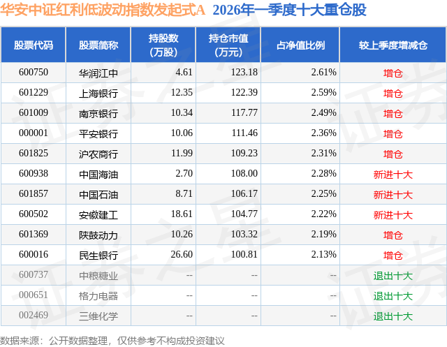 从基金规模来看,华安中证红利低波动指数发起式A基金2026年一季度公布的基金规模为0.3亿元,较上一期规模2579.98万元变化了400.05万元,环比变化了15.51%。该基金最新一期资产配置为:股票占净值比93.86%,无债券类资产,现金占净值比6.43%。从基金持仓来看,该基金当季前十大股票仓位达23.43%,第一大重仓股为华润江中(600750),持仓占比为2.61%。