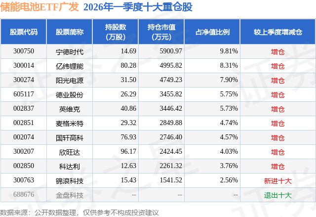 证券之星消息,日前储能电池ETF广发基金公布一季报,2026年一季度最新规模6.01亿元,季度净值涨幅为2.47%。