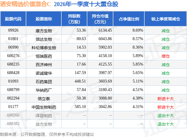 从基金规模来看,诺安精选价值混合C基金2026年一季度公布的基金规模为4.39亿元,较上一期规模9241.19万元变化了3.46亿元,环比变化了374.78%。该基金最新一期资产配置为:股票占净值比93.36%,无债券类资产,现金占净值比8.65%。从基金持仓来看,该基金当季前十大股票仓位达61.32%,第一大重仓股为康方生物(09926),持仓占比为8.69%。