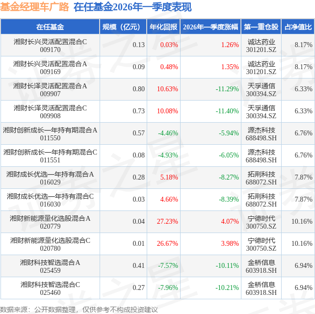 证券之星消息,日前湘财新能源量化选股混合C基金公布一季报,2026年一季度最新规模0.01亿元,季度净值涨幅为3.98%。