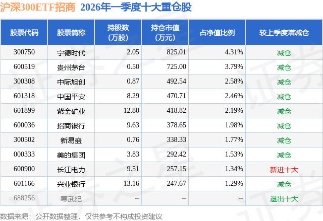 从基金规模来看,沪深300ETF招商基金2026年一季度公布的基金规模为1.91亿元,较上一期规模2.98亿元变化了-1.07亿元,环比变化了-35.84%。该基金最新一期资产配置为:股票占净值比99.5%,无债券类资产,现金占净值比1.12%。从基金持仓来看,该基金当季前十大股票仓位达23.24%,第一大重仓股为宁德时代(300750),持仓占比为4.31%。
