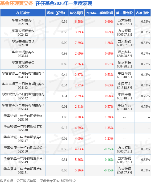 证券之星消息,日前华富安福债券D基金公布一季报,2026年一季度最新规模0.0亿元,季度净值涨幅为1.28%。