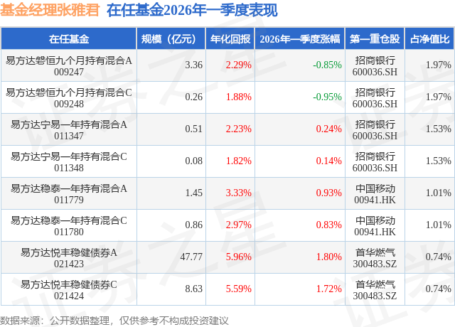 证券之星消息,日前易方达悦丰稳健债券A基金公布一季报,2026年一季度最新规模47.77亿元,季度净值涨幅为1.8%。