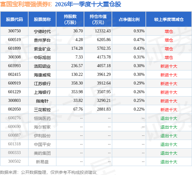 从基金规模来看,富国宝利增强债券E基金2026年一季度公布的基金规模为70.31亿元,较上一期规模13.13亿元变化了57.18亿元,环比变化了435.47%。该基金最新一期资产配置为:股票占净值比19.25%,债券占净值比84.55%,现金占净值比2.03%。从基金持仓来看,该基金当季前十大股票仓位达3.76%,第一大重仓股为宁德时代(300750),持仓占比为0.93%。