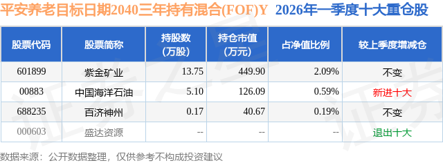 从基金规模来看,平安养老目标日期2040三年持有混合(FOF)Y基金2026年一季度公布的基金规模为0.01亿元,较上一期规模7.33万元变化了74.49万元,环比变化了1016.7%。该基金最新一期资产配置为:股票占净值比2.87%,无债券类资产,现金占净值比10.84%。从基金持仓来看,该基金当季前十大股票仓位达2.87%,第一大重仓股为紫金矿业(601899),持仓占比为2.09%。