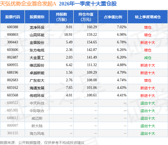 从基金规模来看,天弘优势企业混合发起A基金2026年一季度公布的基金规模为0.11亿元,较上一期规模541.51万元变化了544.53万元,环比变化了100.56%。该基金最新一期资产配置为:股票占净值比90.86%,无债券类资产,现金占净值比9.8%。从基金持仓来看,该基金当季前十大股票仓位达56.49%,第一大重仓股为龙净环保(600388),持仓占比为7.02%。