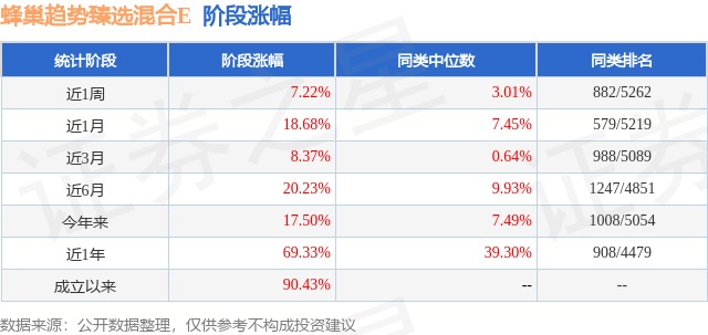 从业绩表现来看,蜂巢趋势臻选混合E基金过去一年净值涨幅为69.33%,在同类基金中排名908/4479,同类基金过去一年净值涨幅中位数为39.3%。而基金过去一年的最大回撤为-16.22%,成立以来的最大回撤为-22.12%。