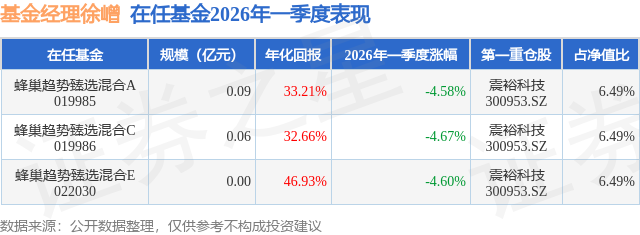 证券之星消息,日前蜂巢趋势臻选混合E基金公布一季报,2026年一季度最新规模0.0亿元,季度净值涨幅为-4.6%。
