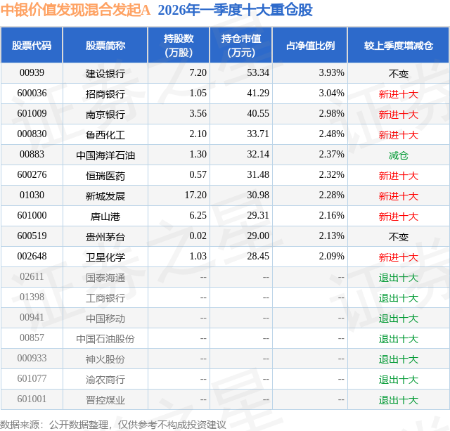 对本季度基金运作,基金经理的观点如下:1.宏观经济分析 全球宏观方面,一季度特别是后半段地缘冲突成为主导全球宏观叙事的核心变量。中东地缘冲突加剧了通胀压力与增长前景的不确定性,主要央行货币政策从降息预期转向通胀警惕,全球财政政策在应对能源危机与支持经济增长之间寻求平衡,市场交易逻辑从"增长韧性+温和降息"快速切换至"滞胀担忧"。美国方面,虽然年初以来经济数据整体稳健,但滞胀风险明显上升,美联储连续两次会议暂停降息,市场降息预期大幅推迟。欧元区受内部需求疲软及地缘冲击外溢影响,复苏动能持续偏弱,区域增长分化格局下政策宽松节奏受通胀与增长平衡制约。日本经济在能源成本飙升与内需不足的双重压力下增速放缓,尽管企业信心短期改善,但滞胀风险凸显,货币政策正常化进程开始面临较大不确定性。 国内宏观方面,面临外部地缘冲击和不确定性加大的形势,国内坚持以我为主,坚守高质量发展的框架,围绕十五五纲要有序推进经济高质量发展布局,同时以提升消费率为核心优化内需结构。宏观调控政策保持连续稳定,财政政策强调固本增效,货币政策相对温和宽松。同时,国内经济基本面积极的因素在增多,出口仍是经济增长的重要拉动,消费和投资动能均有回暖,价格方面通胀读数呈上升趋势,名义GDP增速预计明显抬升。整体上,中国经济仍然呈现出很强的活力与韧性,科技创新、产业升级与内需潜力释放仍在不断进行和强化过程中。 2.市场回顾 股票市场方面,受中东地缘冲突升级影响,2026年一季度A股市场先扬后抑,上证综合指数在创近十年新高后震荡回落,一季度下跌1.94%。代表大盘股表现的沪深300指数下跌3.89%,中证A500指数下跌2.06%,创业板综合指数小幅下跌0.49%,中小板综合指数涨幅归零。 债券市场方面,一季度债市整体上涨,结构上信用债相对表现更好。其中,中债总财富指数上涨0.81%,中债银行间国债财富指数上涨0.69%,中债企业债总财富指数上涨0.83%。在收益率曲线方面,国债收益率曲线走势延续陡峭化。其中,10年国债收益率从1.85%下行3.02bps至1.82%,10年期国开债收益率从2.00%下行5.52bps至1.95%,10年国债与1年国债期限利差从51.01bps走扩8.58bps至59.59bps,30年国债与10年国债期限利差从42.01bps走扩11.49bps至53.50bps。 可转债方面,一季度中证转债指数下跌1.14%。 3.运行分析 一季度股票市场整体收跌,债券市场收涨。我们看好A股市场的整体表现,因此策略上本基金保持稳定的股票仓位。一季度在地缘冲突事件之后,我们对组合进行了一定的调整。我们增加了银行、公用事业等板块的配置比例,同时也增加了石油、化工、煤炭等板块的配置比例。我们看好煤炭、石油化工、有色、建材等行业,不仅是基于供给端出现了收缩的迹象或者国家可能出台管控产能的政策,还由于美伊冲突之后,全球能源价格和产业链面临重大变化,价格中枢可能较长时间内维持较高水平,而中国的能源产业优势进一步凸显,因此我们维持看好以上行业。我们组合的构建思路仍以低估值为主,重点配置估值低的优质行业龙头。