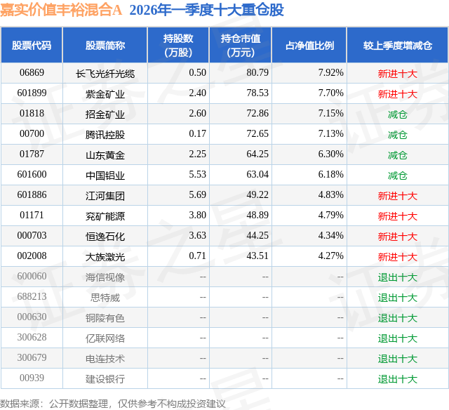从基金规模来看,嘉实价值丰裕混合A基金2026年一季度公布的基金规模为0.05亿元,较上一期规模4271.74万元变化了-3736.85万元,环比变化了-87.48%。该基金最新一期资产配置为:股票占净值比83.61%,债券占净值比7.95%,现金占净值比6.61%。从基金持仓来看,该基金当季前十大股票仓位达60.61%,第一大重仓股为长飞光纤光缆(06869),持仓占比为7.92%。