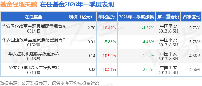 证券之星消息,日前华安红利机遇股票发起式A基金公布一季报,2026年一季度最新规模0.14亿元,季度净值涨幅为-1.92%。