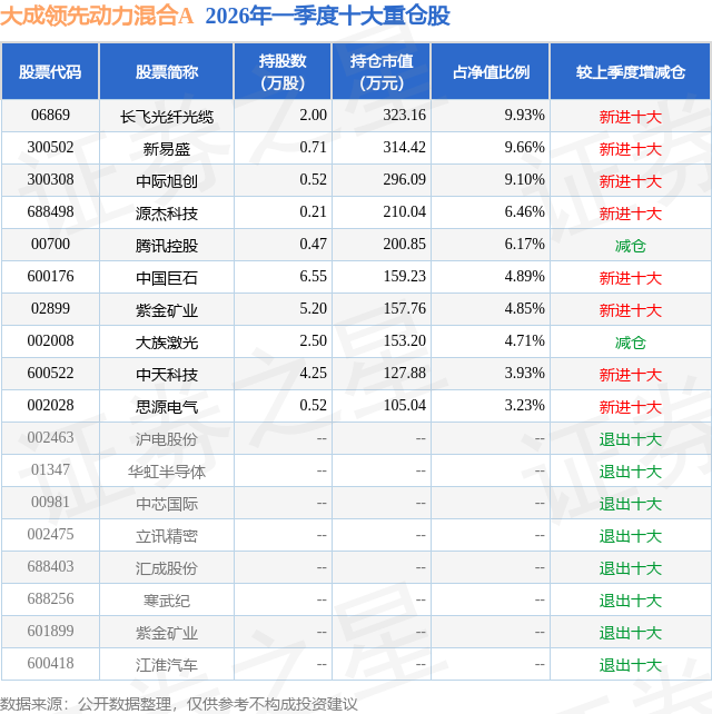 从基金规模来看,大成领先动力混合A基金2026年一季度公布的基金规模为0.2亿元,较上一期规模863.98万元变化了1169.22万元,环比变化了135.33%。该基金最新一期资产配置为:股票占净值比87.59%,无债券类资产,现金占净值比13.71%。从基金持仓来看,该基金当季前十大股票仓位达62.93%,第一大重仓股为长飞光纤光缆(06869),持仓占比为9.93%。