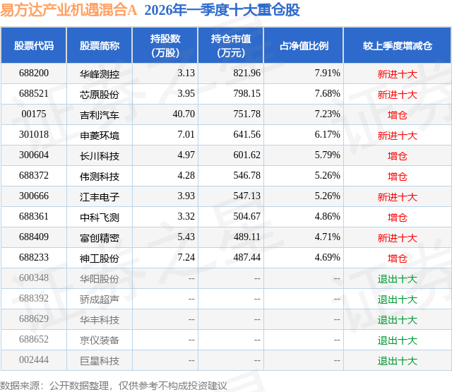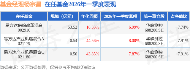 从基金规模来看,易方达产业机遇混合A基金2026年一季度公布的基金规模为0.54亿元,较上一期规模612.4万元变化了4791.21万元,环比变化了782.37%。该基金最新一期资产配置为:股票占净值比92.14%,债券占净值比0.01%,现金占净值比7.83%。从基金持仓来看,该基金当季前十大股票仓位达59.56%,第一大重仓股为华峰测控(688200),持仓占比为7.91%。