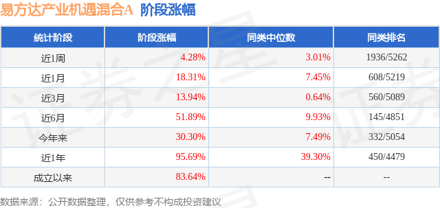 从业绩表现来看,易方达产业机遇混合A基金过去一年净值涨幅为95.69%,在同类基金中排名450/4479,同类基金过去一年净值涨幅中位数为39.3%。而基金过去一年的最大回撤为-14.25%,成立以来的最大回撤为-22.95%。