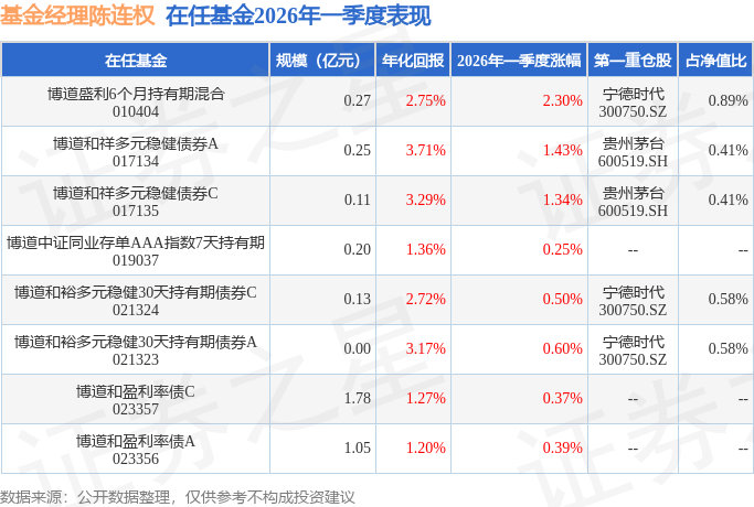 证券之星消息,日前博道和裕多元稳健30天持有期债券A基金公布一季报,2026年一季度最新规模0.0亿元,季度净值涨幅为0.6%。