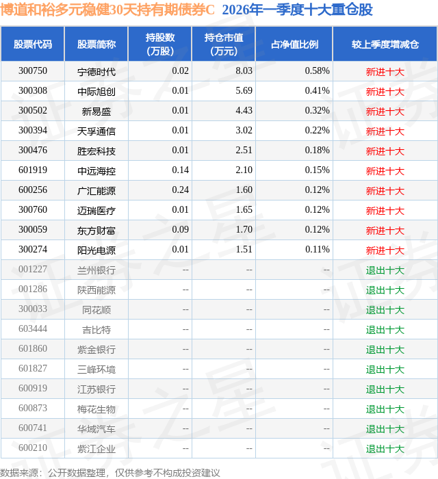 从基金规模来看,博道和裕多元稳健30天持有期债券C基金2026年一季度公布的基金规模为0.13亿元,较上一期规模1.05亿元变化了-9186.37万元,环比变化了-87.24%。该基金最新一期资产配置为:股票占净值比8.77%,债券占净值比80.87%,现金占净值比9.02%。从基金持仓来看,该基金当季前十大股票仓位达2.33%,第一大重仓股为宁德时代(300750),持仓占比为0.58%。