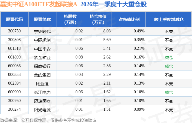 从基金规模来看,嘉实中证A100ETF发起联接A基金2026年一季度公布的基金规模为0.15亿元,较上一期规模1201.03万元变化了338.8万元,环比变化了28.21%。该基金最新一期资产配置为:股票占净值比3.95%,债券占净值比1.22%,现金占净值比4.29%。从基金持仓来看,该基金当季前十大股票仓位达1.91%,第一大重仓股为宁德时代(300750),持仓占比为0.49%。
