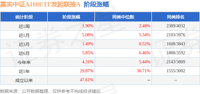 证券之星消息,日前嘉实中证A100ETF发起联接A基金公布一季报,2026年一季度最新规模0.15亿元,季度净值涨幅为-3.21%。