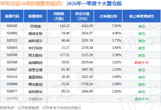 从基金规模来看,华安北证50成份指数发起式C基金2026年一季度公布的基金规模为4.82亿元,较上一期规模3.33亿元变化了1.48亿元,环比变化了44.48%。该基金最新一期资产配置为:股票占净值比94.19%,无债券类资产,现金占净值比6.04%。从基金持仓来看,该基金当季前十大股票仓位达38.62%,第一大重仓股为贝特瑞(920185),持仓占比为7.05%。