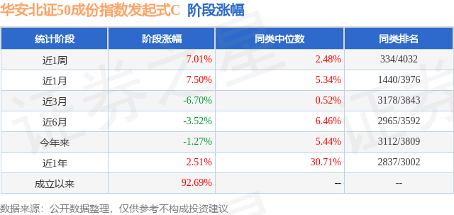 从业绩表现来看,华安北证50成份指数发起式C基金过去一年净值涨幅为2.51%,在同类基金中排名2837/3002,同类基金过去一年净值涨幅中位数为30.71%。而基金过去一年的最大回撤为-23.86%,成立以来的最大回撤为-27.07%。
