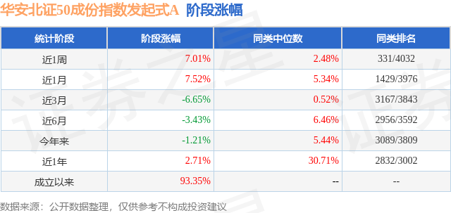 从业绩表现来看,华安北证50成份指数发起式A基金过去一年净值涨幅为2.71%,在同类基金中排名2832/3002,同类基金过去一年净值涨幅中位数为30.71%。而基金过去一年的最大回撤为-23.78%,成立以来的最大回撤为-27.05%。