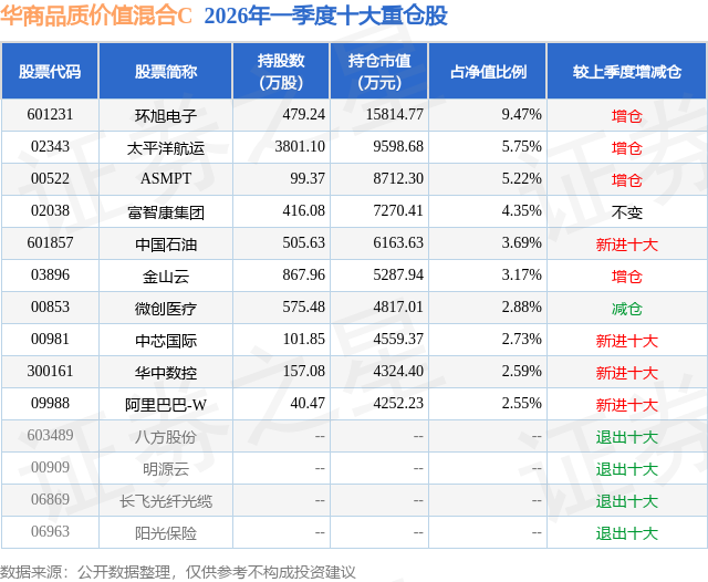 从基金规模来看,华商品质价值混合C基金2026年一季度公布的基金规模为9.65亿元,较上一期规模4273.7万元变化了9.22亿元,环比变化了2157.32%。该基金最新一期资产配置为:股票占净值比90.38%,无债券类资产,现金占净值比11.34%。从基金持仓来看,该基金当季前十大股票仓位达42.4%,第一大重仓股为环旭电子(601231),持仓占比为9.47%。