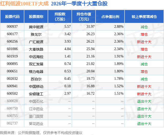 从基金规模来看,红利低波100ETF大成基金2026年一季度公布的基金规模为0.11亿元,较上一期规模1200.98万元变化了-90.32万元,环比变化了-7.52%。该基金最新一期资产配置为:股票占净值比98.15%,无债券类资产,现金占净值比2.01%。从基金持仓来看,该基金当季前十大股票仓位达20.35%,第一大重仓股为冀中能源(000937),持仓占比为2.88%。