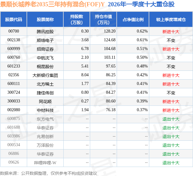 从基金规模来看,景顺长城养老2035三年持有混合(FOF)Y基金2026年一季度公布的基金规模为0.06亿元,较上一期规模65.87万元变化了517.61万元,环比变化了785.74%。该基金最新一期资产配置为:股票占净值比9.2%,无债券类资产,现金占净值比6.63%。从基金持仓来看,该基金当季前十大股票仓位达4.72%,第一大重仓股为腾讯控股(00700),持仓占比为0.62%。